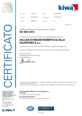 L’azienda Valcar, svolgendo la propria attività nel massimo rispetto di tutti i criteri di qualità, ha conseguito, la certificazione di conformità alla norma ISO 9001:2015 in materia di Qualità di erogazione di prodotti/servizi inerenti: Lavorazioni meccaniche di precisione a controllo numerico su specifica del cliente.